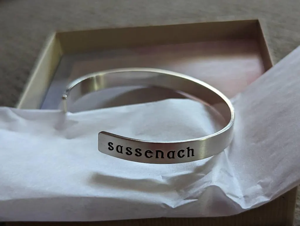 A perfect gift for your favorite Outlander fan! This bracelet, available in aluminum, brass, or copper, is hand stamped with "sassenach" and accented with a Scottish thistle on the opposite side. Meaning English person in Gaelic, sassenach is Jamie's nickname for Claire in the Outlander series. The bracelet measures 1/4" x 6" and is adjustable to fit all sizes.