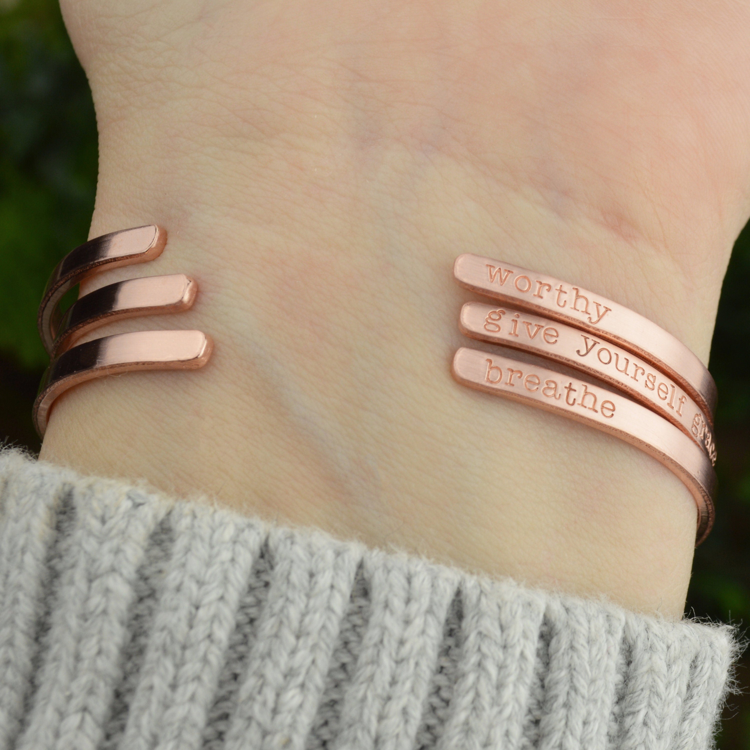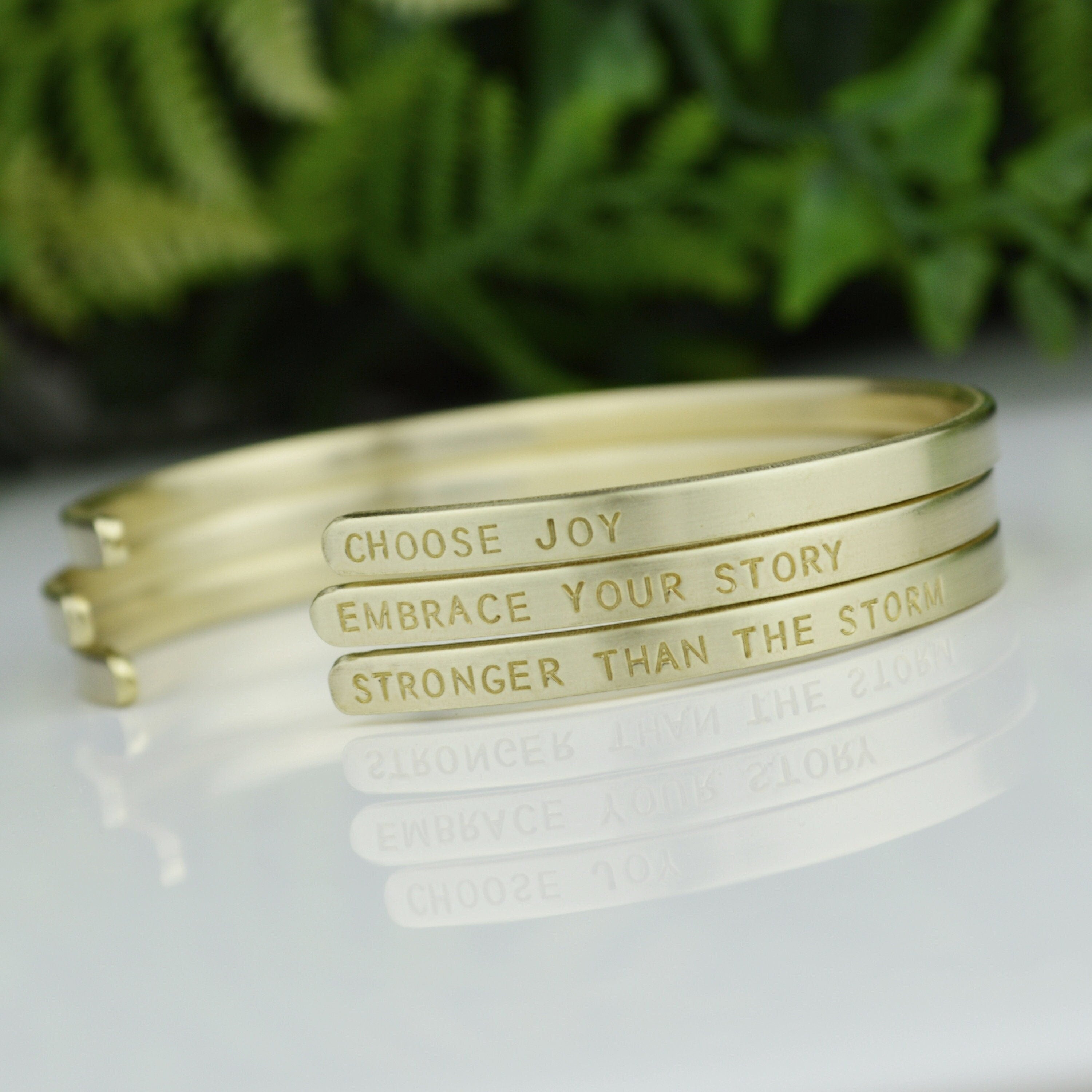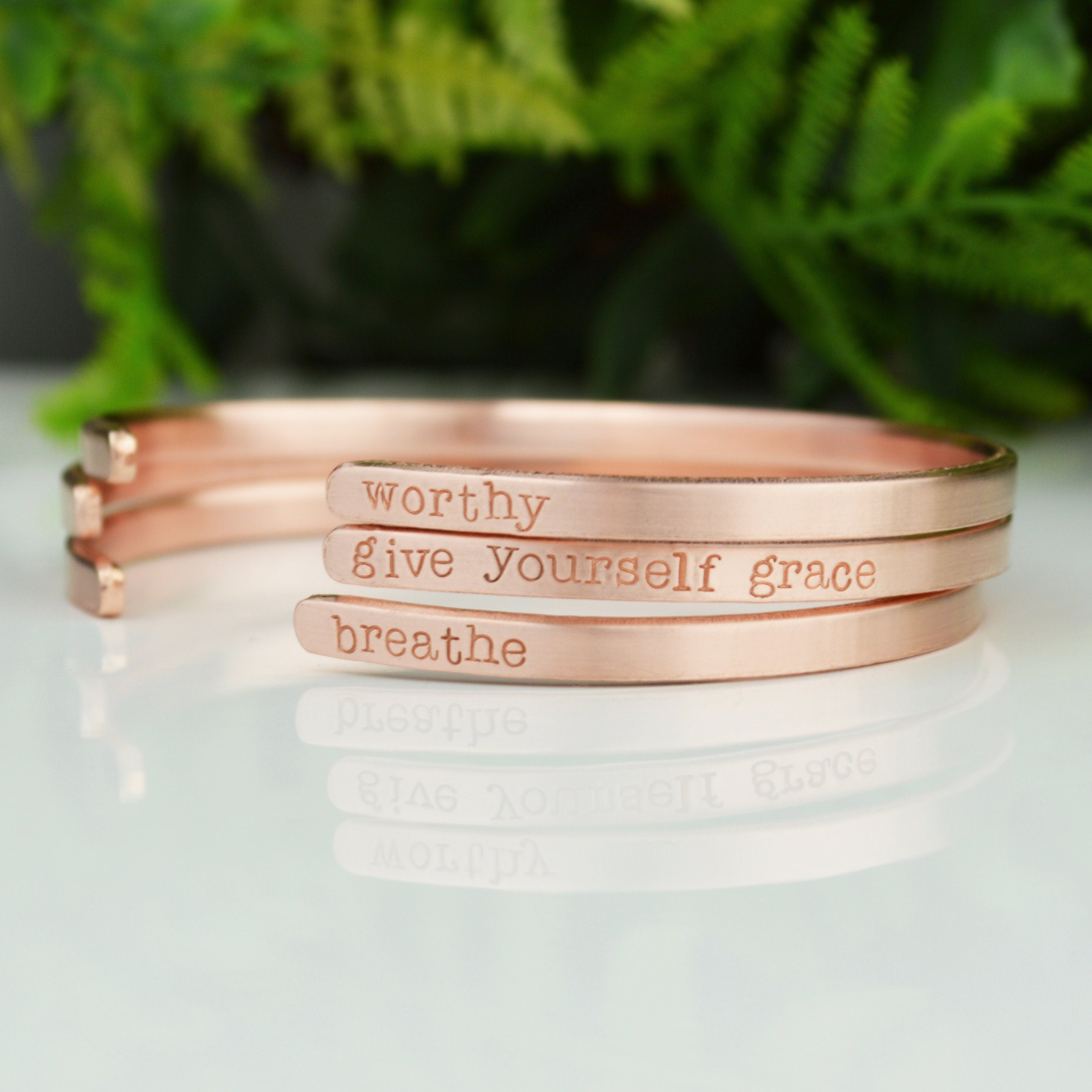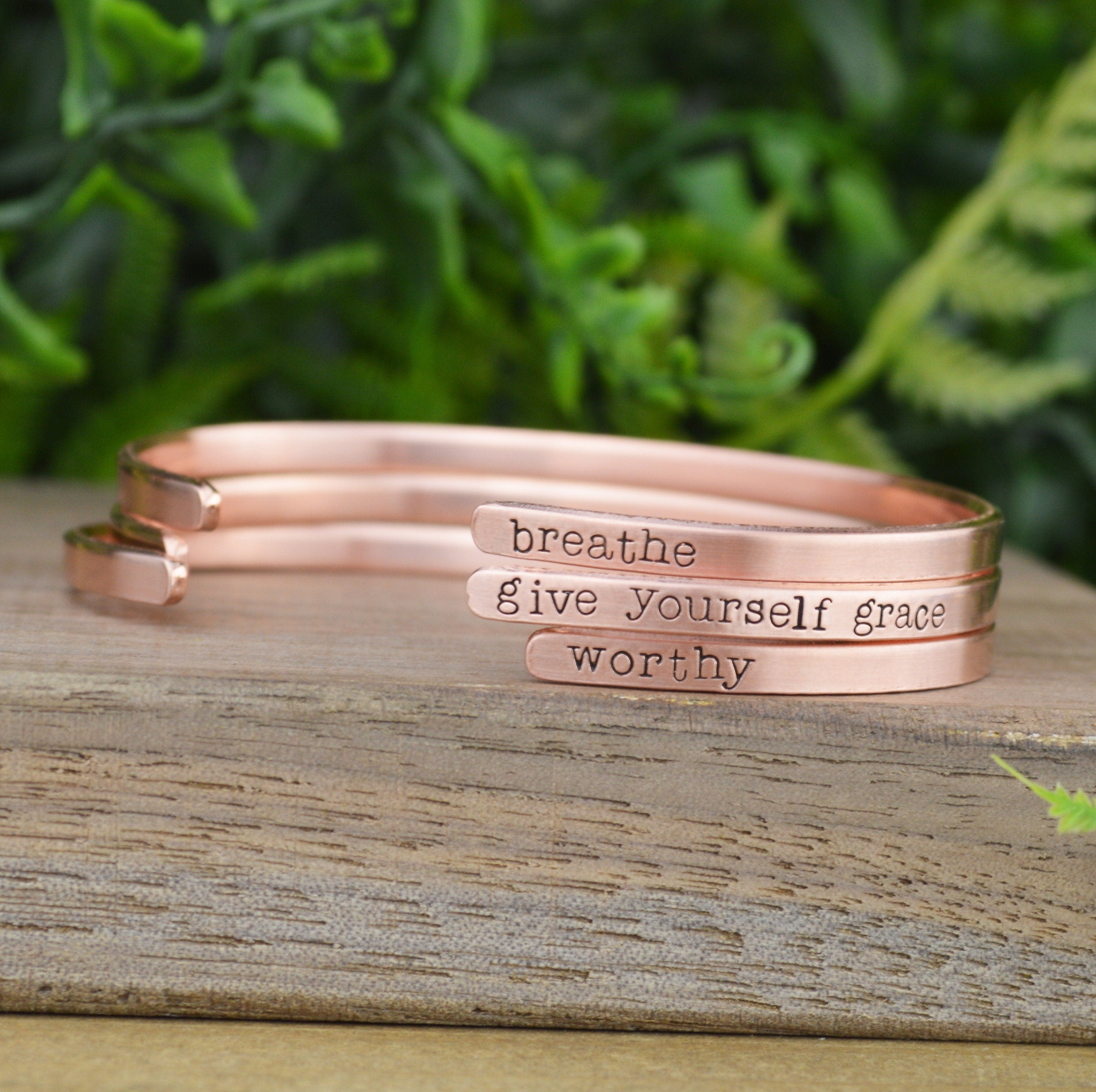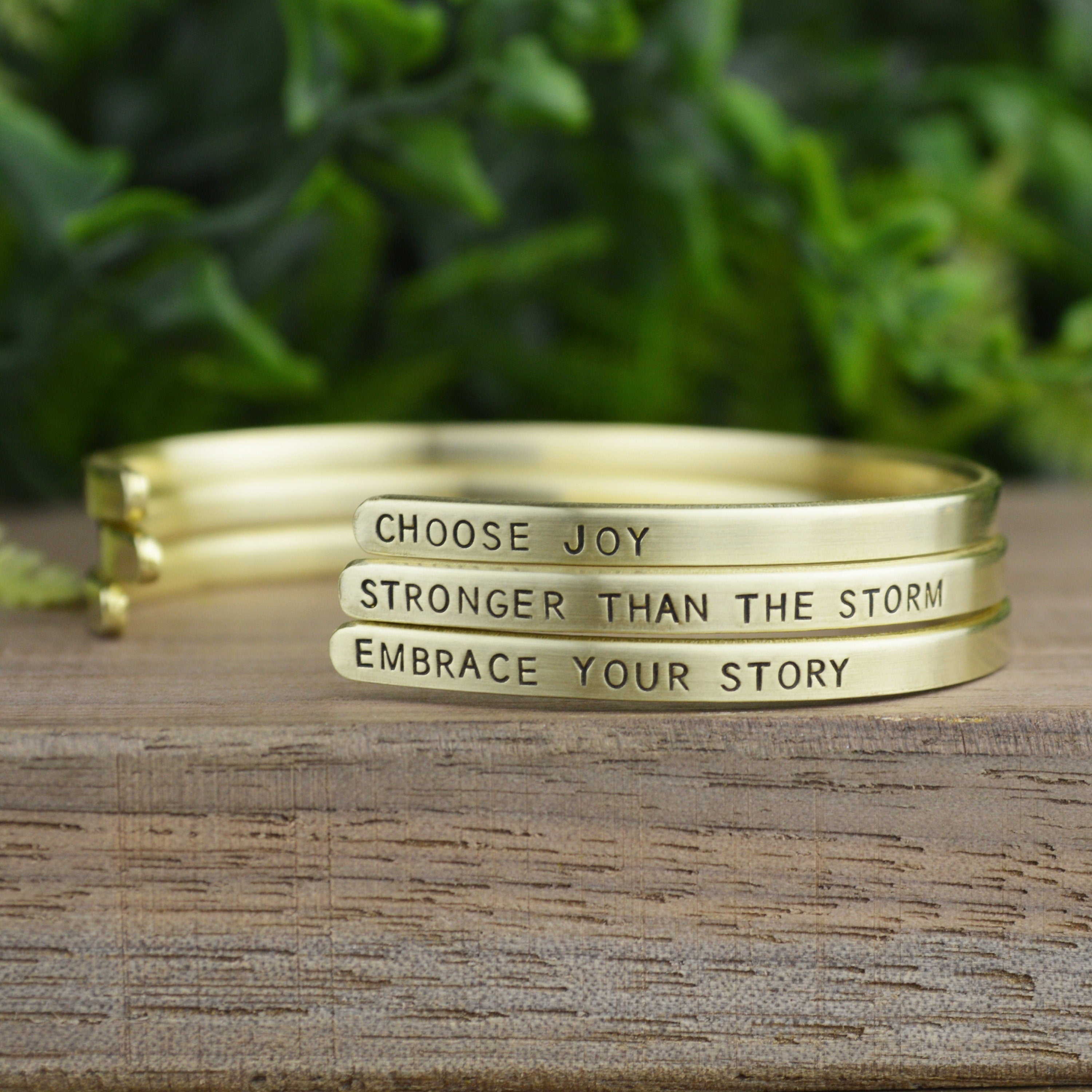 Hand stamping is a very different process than traditional engraving. Hand stamping is done entirely by hand, with a hammer and steel stamp. The stamps have letters or designs carved on the end and each is individually stamped into the metal with a hammer. Every item is carefully handcrafted, so certain variations are to be expected. This adds to the one of a kind nature and overall quality of each piece I create.