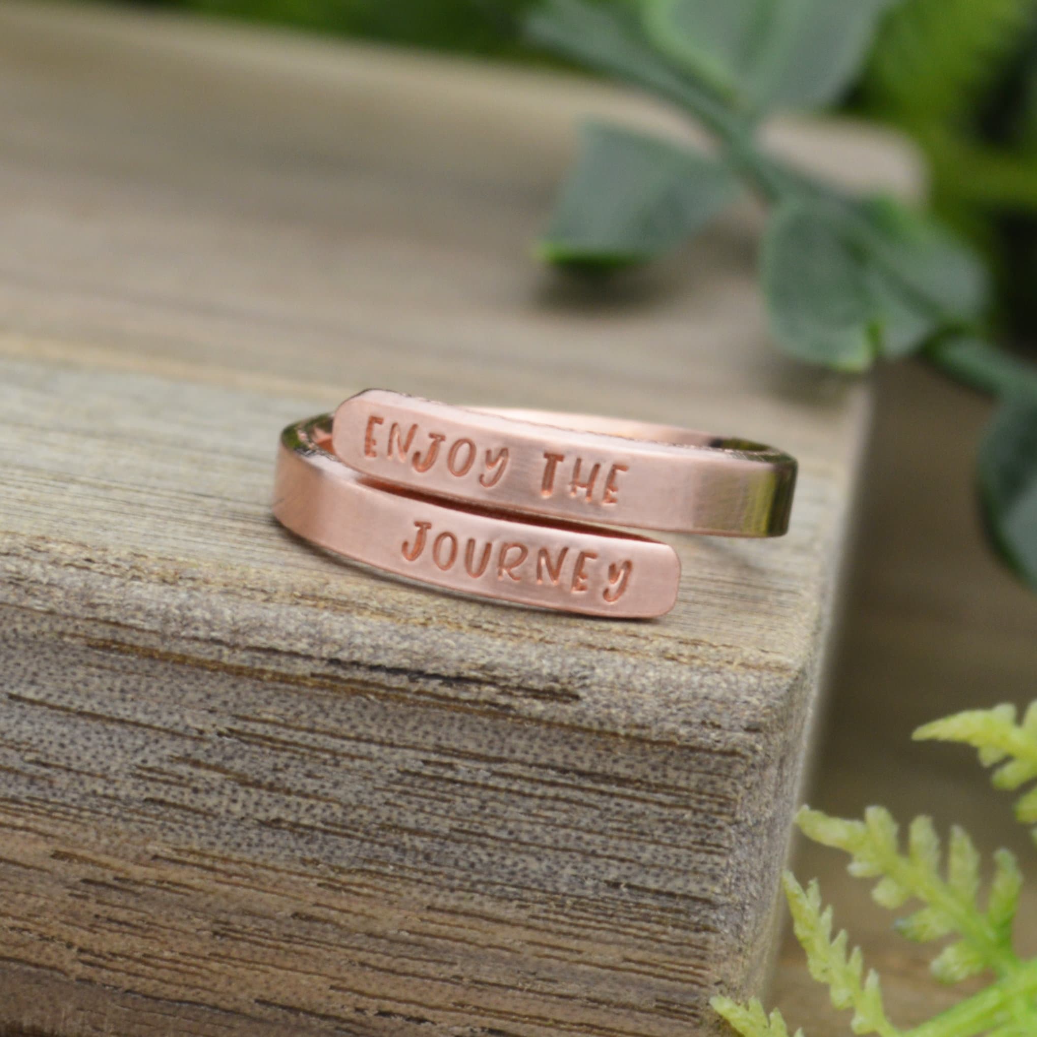 This wrap ring is hand crafted just for you. Special initials, names, a date, or even your favorite place, you name it...I'll stamp it. (Limit of 12 characters per line).