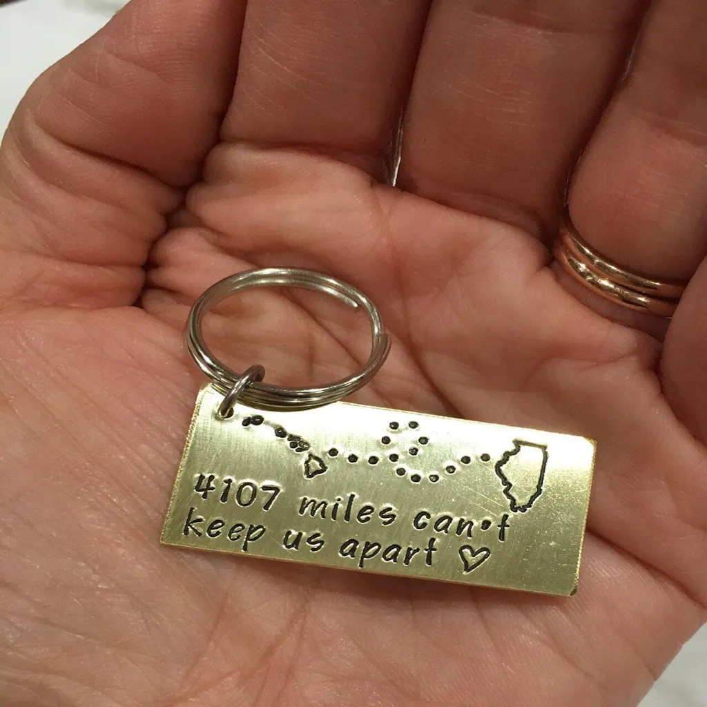 A perfect going away gift, this keychain is personalized with your special states and distance.