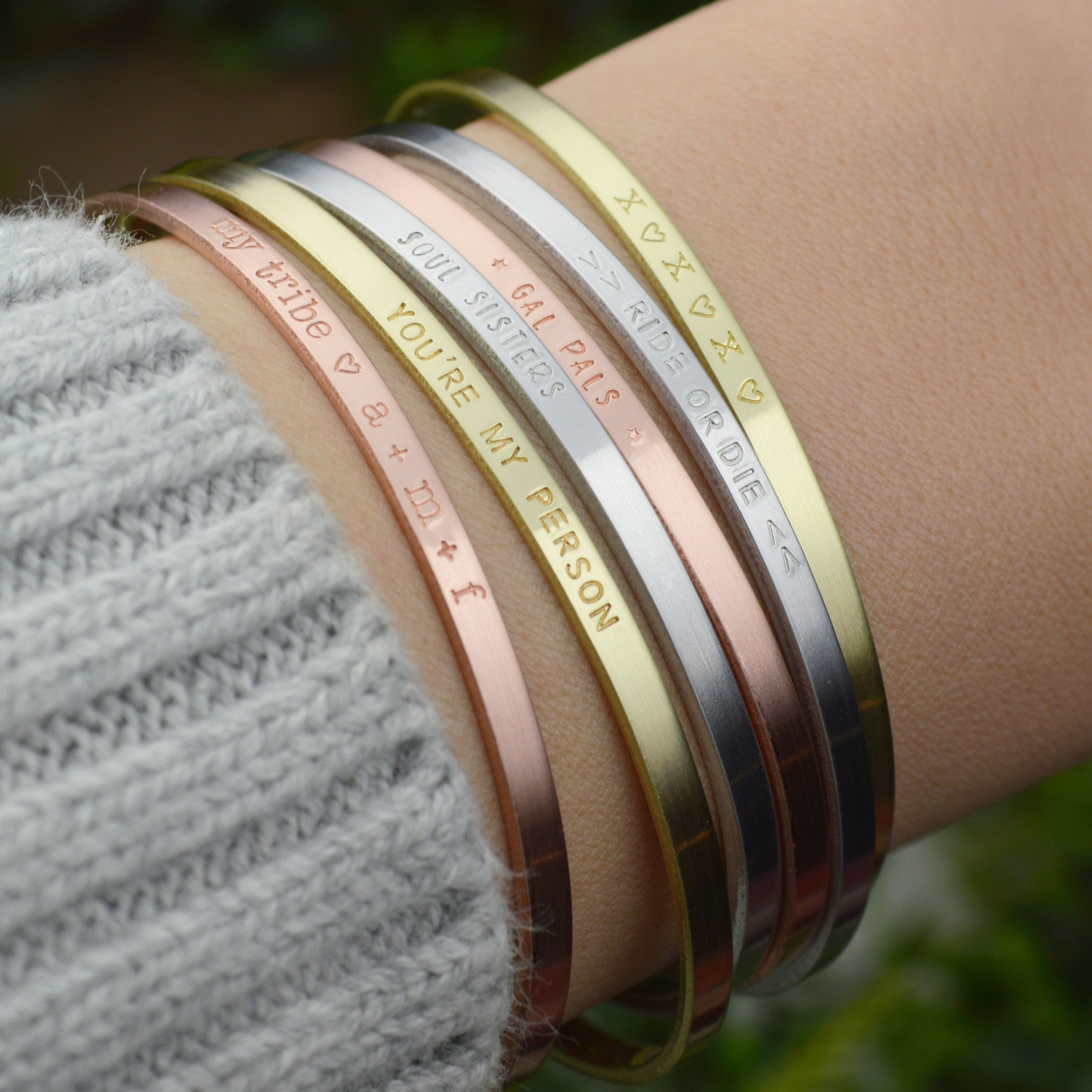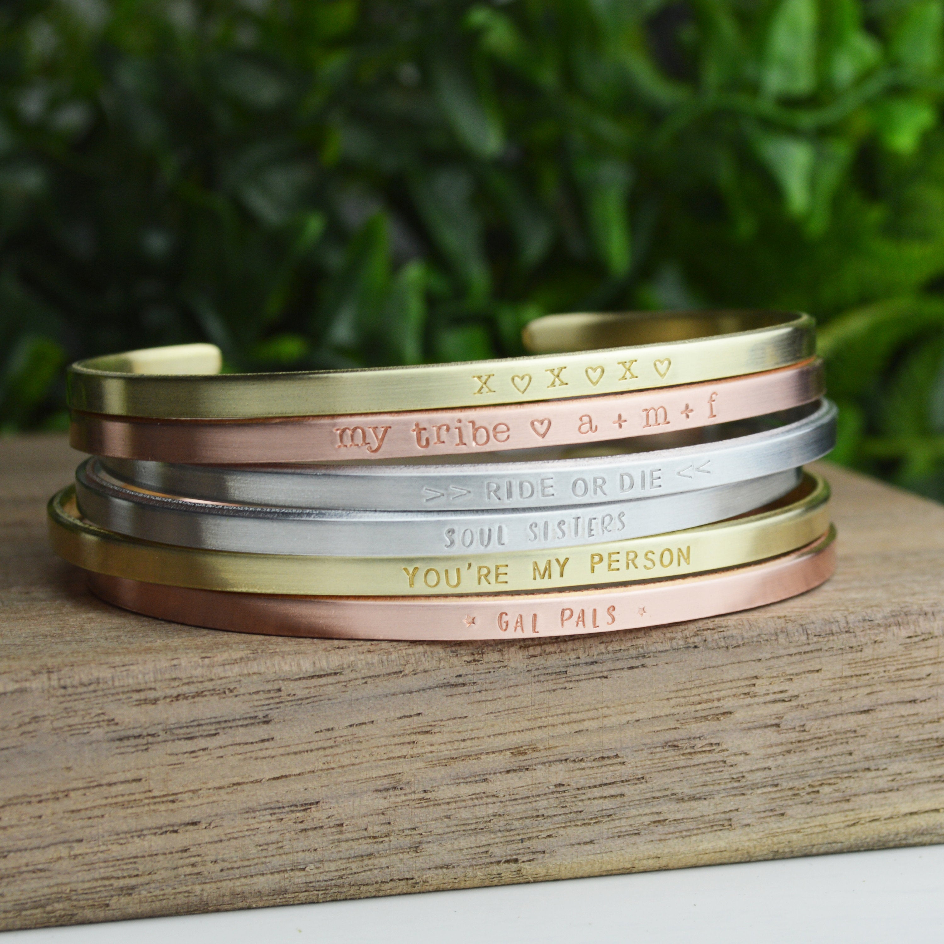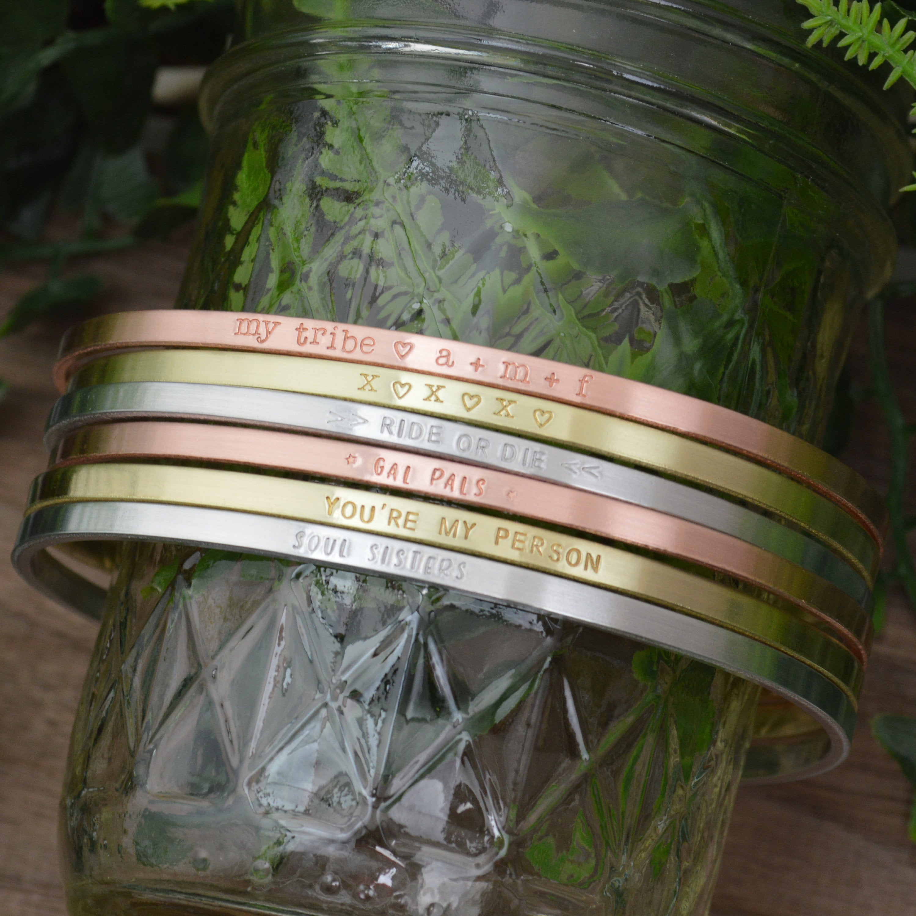 Hand stamping is a very different process than traditional engraving. Hand stamping is done entirely by hand, with a hammer and steel stamp. The stamps have letters or designs carved on the end and each is individually stamped into the metal with a hammer. Every item is carefully handcrafted, so certain variations are to be expected. This adds to the one of a kind nature and overall quality of each piece I create.
