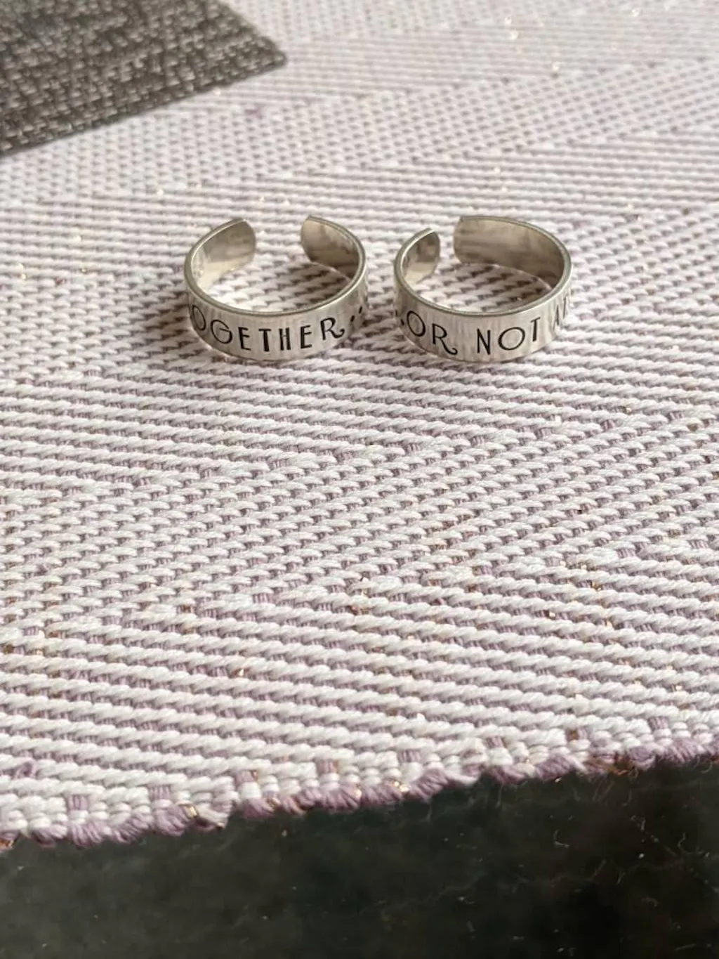 Just as pictured, beautiful rings and great quality done in a requested different font, fit perfectly and the gaps make adjusting possible if needed too. It got shipped off through a Swiss carrier to get to the UK that every so often would say the parcel didn't even exist, and the seller was beyond wonderful trying to keep an eye on it for me. Lovely product and great seller